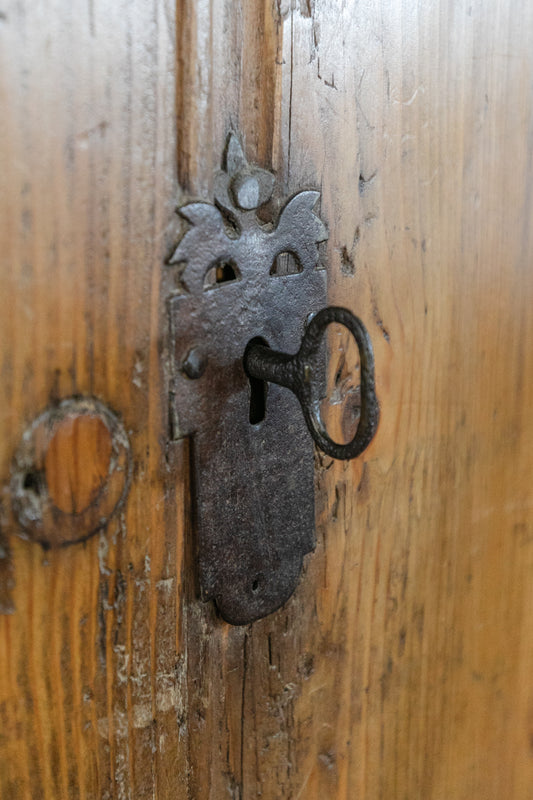 Antique European Pine Cabinet with Drawers and Carved Crest