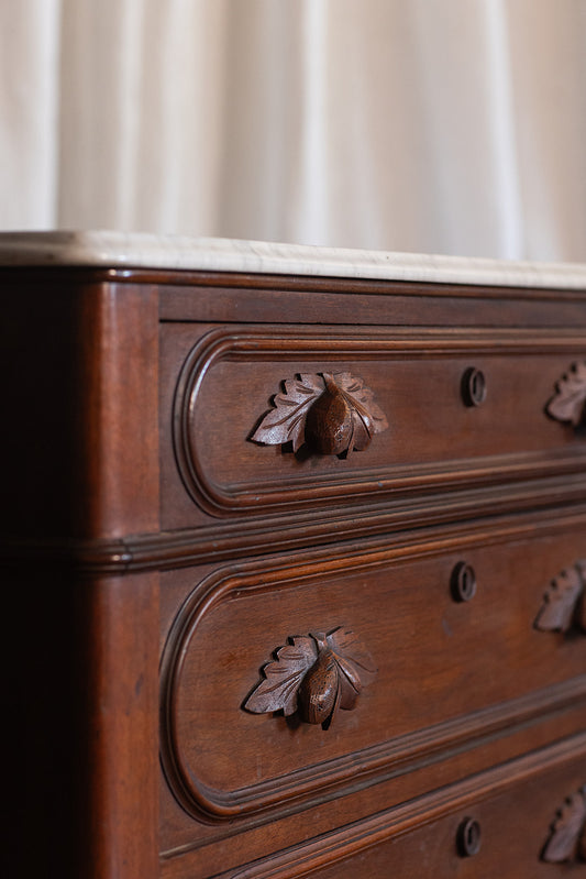 Three Drawer Walnut Chest with Carved Fruit Pulls and Marble Top on Casters - Mid to late 19th Century