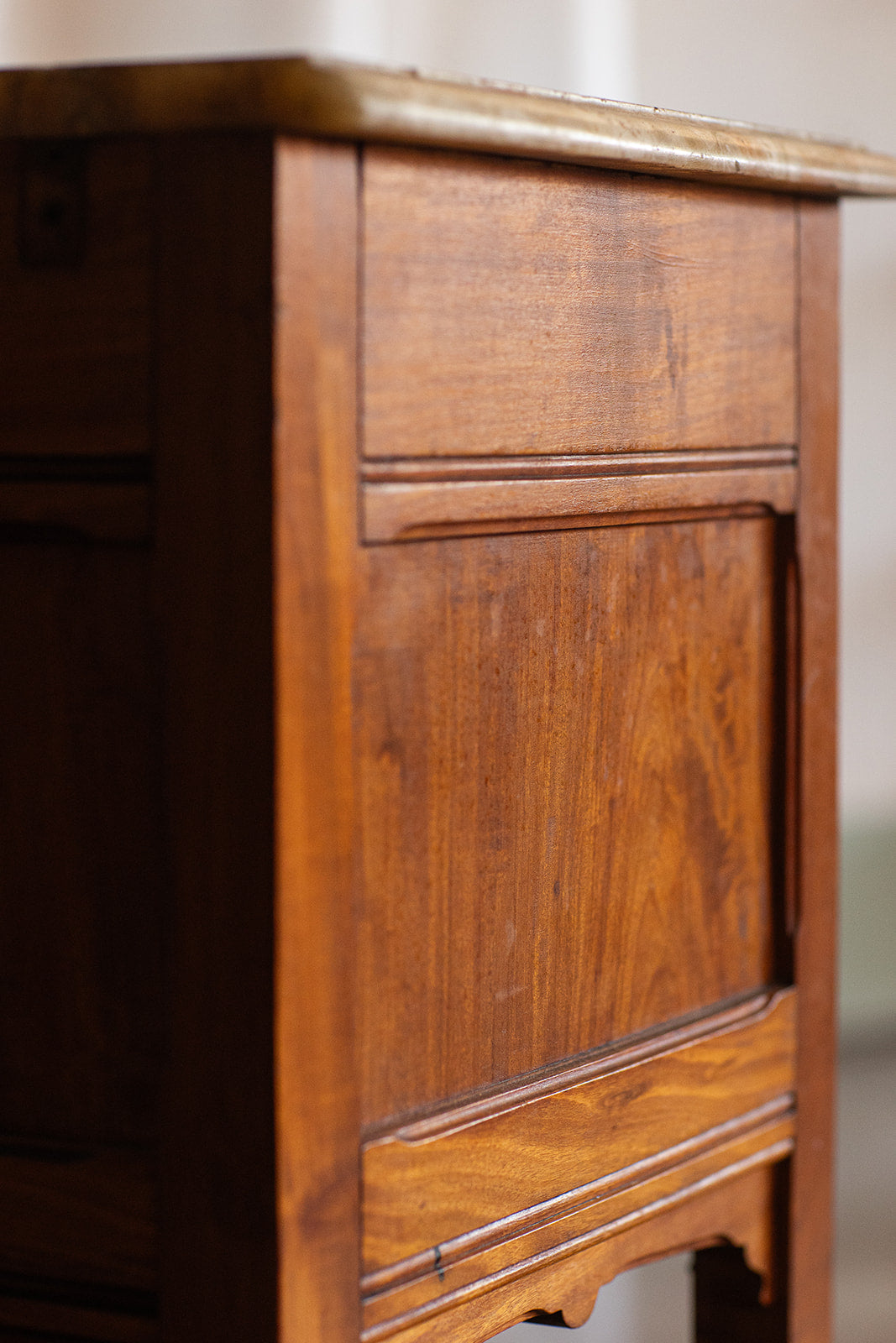 Description: This elegant pair of Art Nouveau nightstands features rich wood tones, intricate detailing, and striking onyx tops with soft, natural veining. Each stand includes a small drawer and cabinet for discreet storage, all accented with original hardware. Perfect for adding timeless character to a bedroom or guest suite.