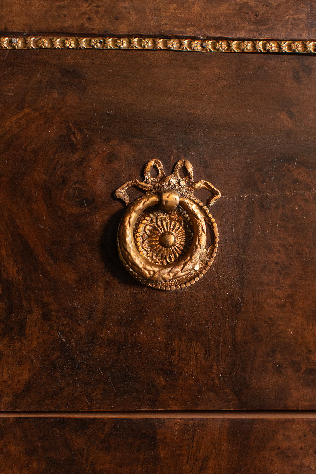 Description: This elegant Louis XVI French chest of drawers features a rich mahogany finish, intricate brass hardware, and a striking marble top. Its symmetrical lines and classic form are hallmarks of the period, offering timeless style and refined storage. Ideal for use in a bedroom, entryway, or formal living space.