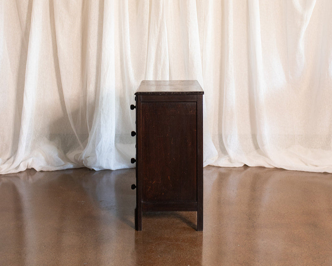Description: This Belgian carved antique chest, circa 1900, features four drawers adorned with striking Gothic-inspired carvings and original wooden knobs. The dark oak finish and scalloped apron add to its old-world charm and craftsmanship. A richly detailed statement piece perfect for adding European character to a bedroom or hallway.