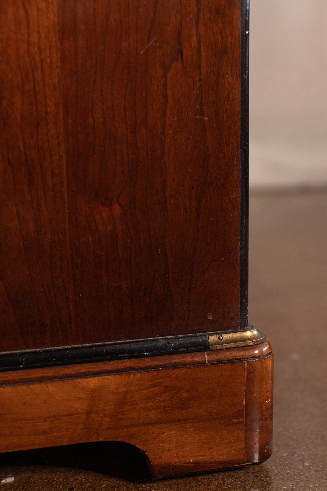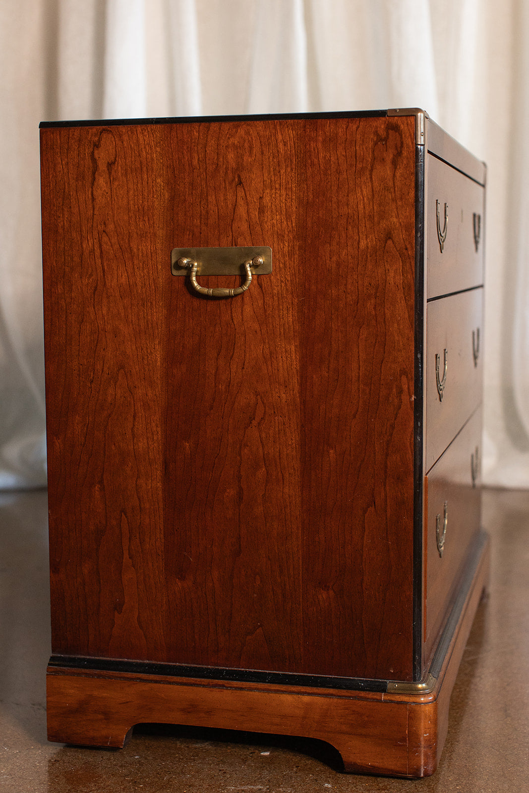 Description: This handsome vintage campaign chest by National Mt. Airy features classic brass recessed hardware and a rich, warm wood finish. With three spacious drawers and clean, tailored lines, it's the perfect blend of utility and elegance for any sophisticated interior.