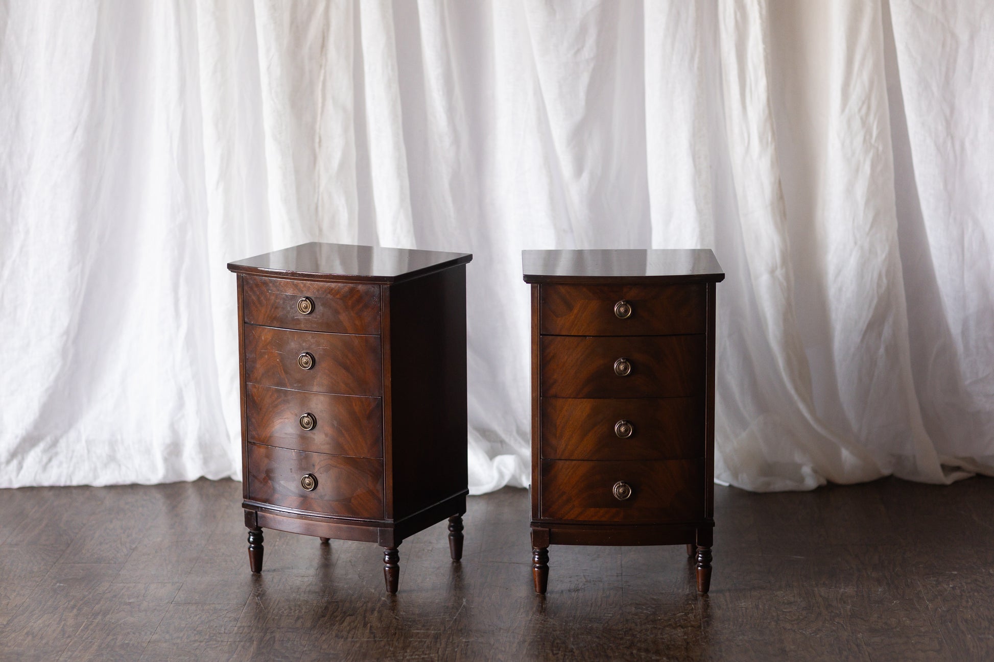 Description: This elegant pair of vintage nightstands features softly curved fronts and rich wood grain that adds warmth and depth to any space. Classic brass ring pulls and tapered legs lend timeless charm with just the right touch of refinement. Beautiful and functional, they make the perfect bedside statement with ample storage for everyday essentials.