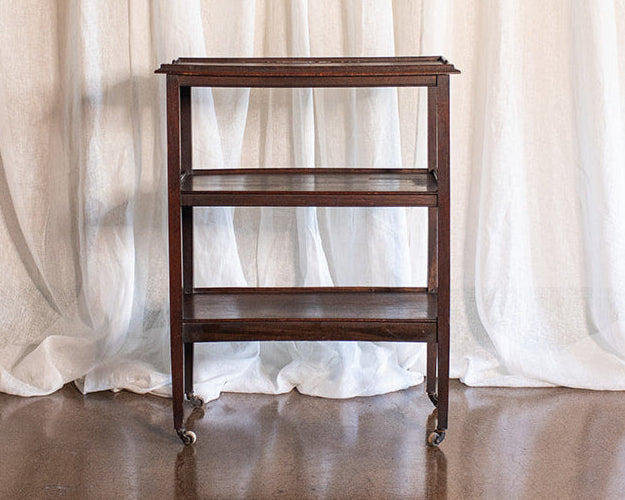 Description: This vintage bar cart features a rich wood frame, two spacious shelves, and smooth-rolling casters for easy mobility. Its clean lines and versatile design make it ideal for use as a drink station, bookshelf, or stylish storage in any room. A timeless piece that combines function and elegance effortlessly.