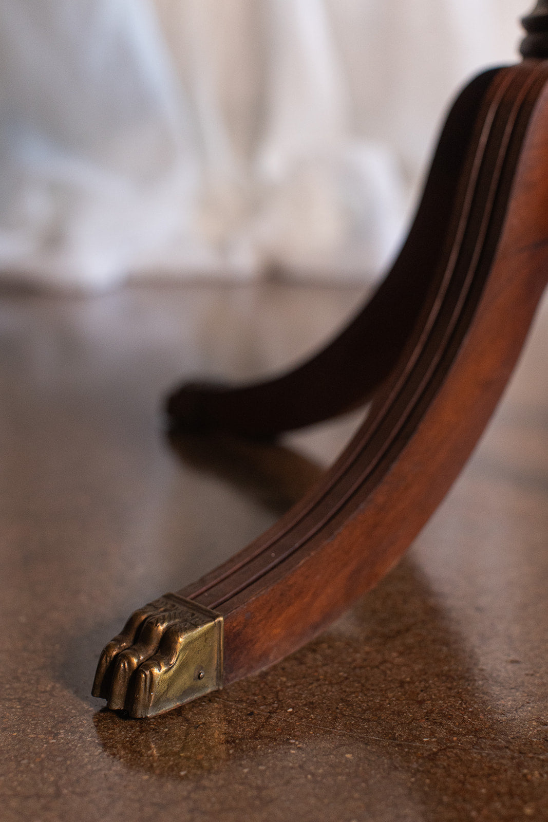 Description: This mid-20th century Federal-style mahogany drum side table features a classic round top, rich wood grain, and traditional brass pulls. Resting on a graceful tripod base with reeded legs and brass-capped feet, it offers timeless elegance and subtle storage in a single drawer. A refined accent piece that brings heritage character to any setting.