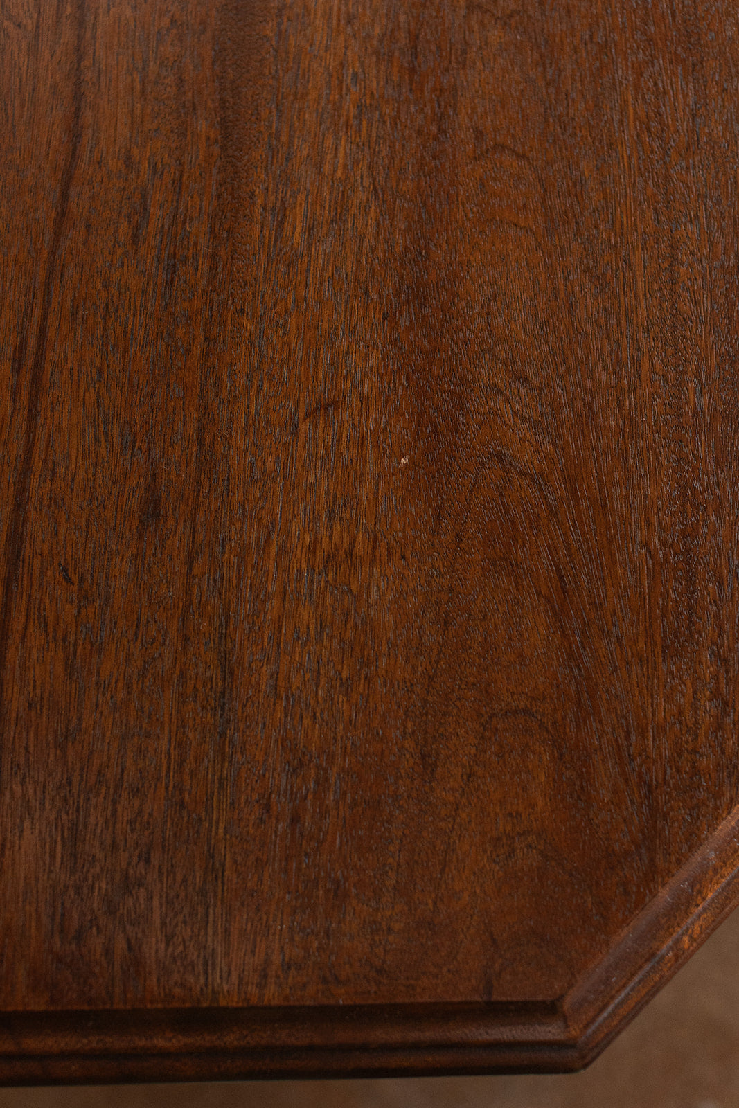 Description: This vintage octagon side table features a beautifully carved edge, rich wood grain, and a gracefully turned pedestal base. Set on smooth-gliding casters, it offers both elegance and ease of movement. Perfect beside a reading chair, in an entryway, or as a charming accent in a cozy nook.