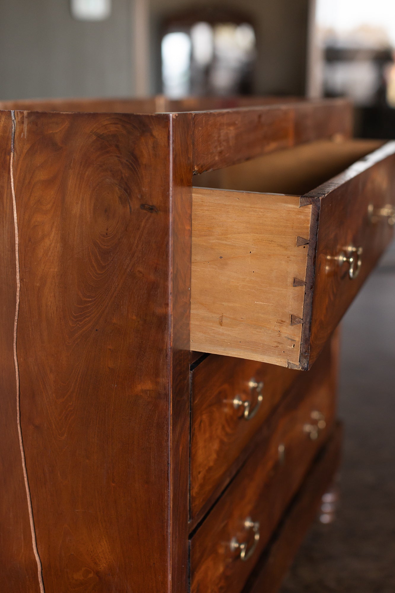 Description: This stunning vintage three-drawer chest showcases rich, bookmatched wood grain with a warm, glowing finish that highlights its natural beauty. The marble top adds an elegant touch, while classic brass pulls and keyholes enhance its timeless appeal. Both functional and refined, it makes a beautiful statement in a bedroom, entryway, or living space.