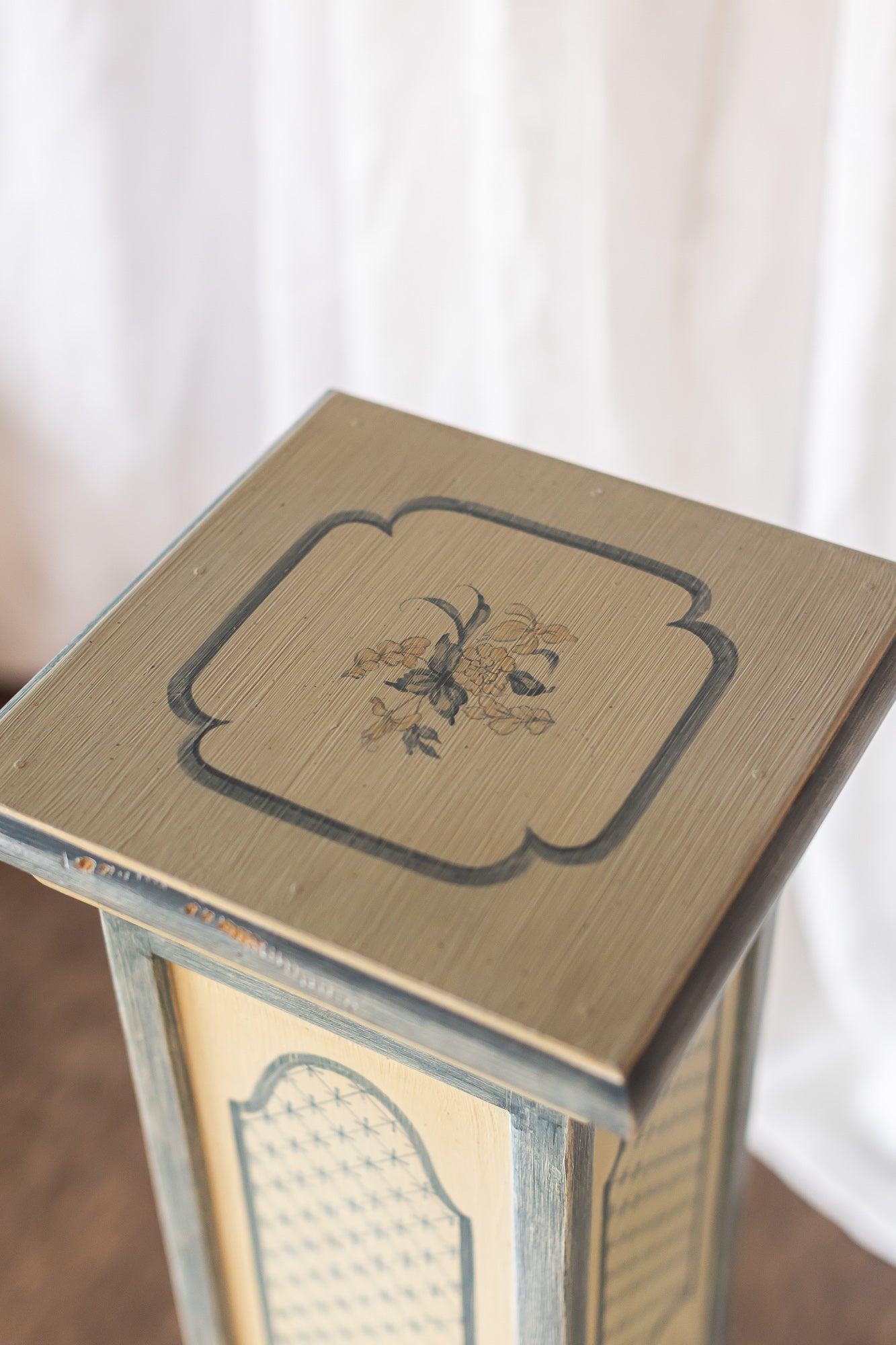 Description: This pair of painted columns features soft blue and cream tones with delicate hand-painted detailing, bringing a refined European-inspired charm to any space. Their tall, architectural form makes them ideal as decorative accents, lamp pedestals, or to frame an entryway or vignette. A beautiful way to add height, texture, and old-world character to a room.